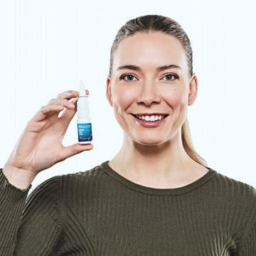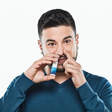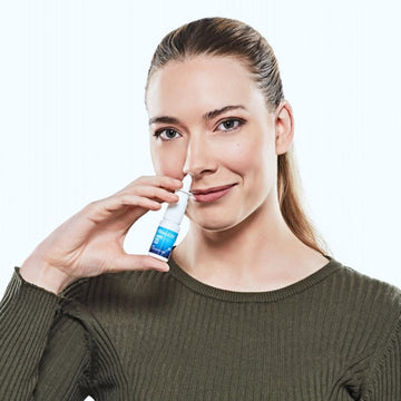 Close one nostril by pressing on that side of your nose, and gently insert the nozzle into the other nostril, pointing it away from the centre of your nose. Press down on the pump to activate the spray while gently breathing in (normal breathing). You don’t need to take a deep breath when applying the nasal spray.